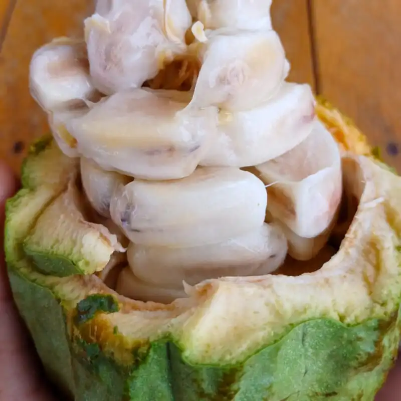 Die Kakaoschoten sind oval und variieren in ihrer Farbe von gelb über orange bis rot oder violett, je nach Reifegrad und Sorte. Jede Schote enthält etwa 20 bis 50 Samen, die als Kakaobohnen bekannt sind. Diese Bohnen sind von einem süß-säuerlichen Fruchtfleisch umgeben, das ebenfalls verzehrt werden kann.