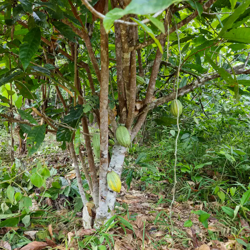 Der Kakaobaum gehört zur Familie der Malvengewächse (Malvaceae) und trägt große, ledrige Blätter, die das ganze Jahr über grün bleiben. Die kleinen, unscheinbaren Blüten wachsen direkt am Stamm und an den größeren Ästen des Baums, eine Erscheinung, die als Kauliflorie bezeichnet wird. Aus diesen Blüten entwickeln sich nach der Bestäubung die Kakaoschoten, die Früchte des Kakaobaums.