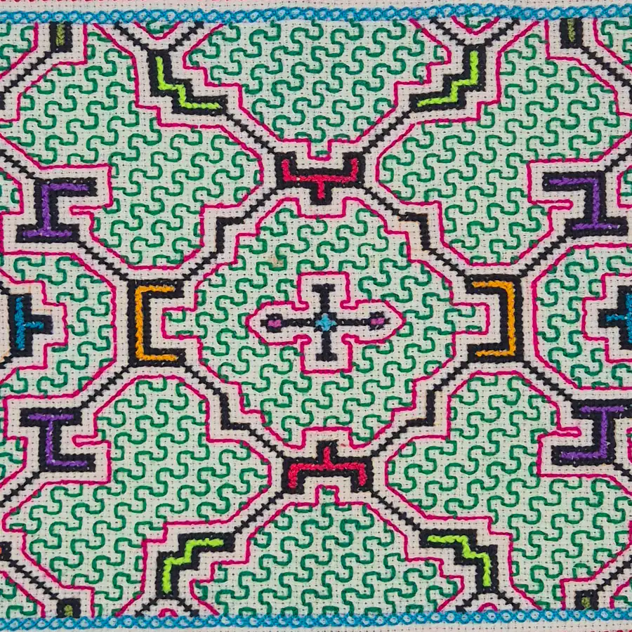 Shipibo Manta – Hand-sewn tella with traditional Ponte Kene pattern