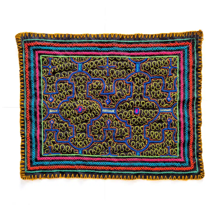 - Hand-embroidered Shipibo Kené shawl from Peru