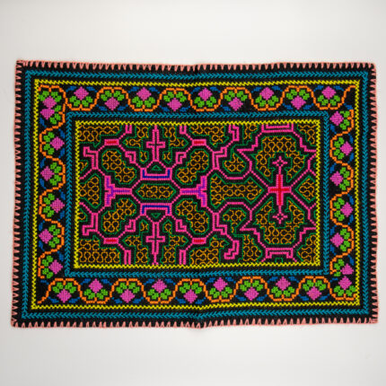 Shipibo Manta with frog design: Kambo Frog. Immerse yourself in the fascinating world of Shipibo culture and its spiritual artworks. This traditional altar cloth is an artistic expression of the unique medicine songs (icaros) of the Shipibo-Conibo and embodies the deep connection with nature. The Kambo frog design, inspired by the sacred Kambo frog of the Amazon rainforests, brings the spirit of this spiritual being to life. It symbolizes the healing power and transformative energy of this frog, which is used in indigenous medicine.