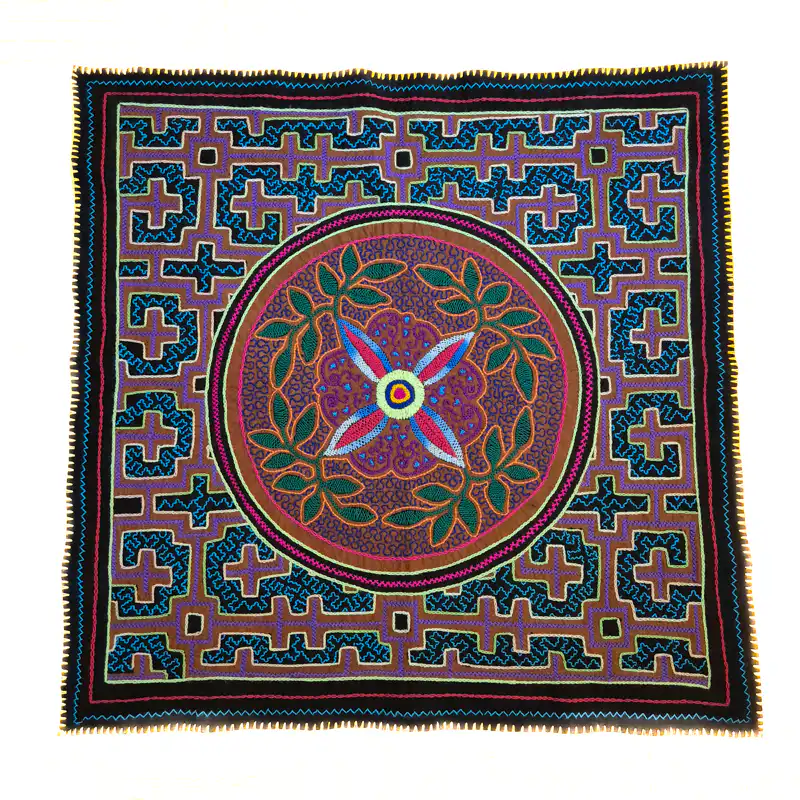 The Shipibo Manta is an extraordinary work of art that reflects the profound culture and spiritual tradition of the Shipibo-Konibo, an indigenous community from the Amazon region in Peru. This handmade shawl impresses with its intricate geometric patterns that represent ancient designs and ancient knowledge. At the heart of the design is a floral, circular pattern surrounded by interwoven, symmetrical lines and shapes that symbolize cosmic energies and connections. The elaborate embroideries tell of the unity between man, nature and the universe and are often associated with spiritual visions experienced during shamanic ceremonies. The bright colours – a harmonious interplay of red, violet, blue, green and yellow – underline the symbolism of vitality and spiritual protection. The filigree patterns not only have an aesthetic meaning, but are also seen in Shipibo culture as representations of healing, protection and spiritual paths. This cloth is ideal as a wall hanging, altar cloth, meditation aid, or unique home accessory that will add deep spiritual and cultural meaning to your space. Each piece is handmade and unique, making it a special and meaningful collector’s item.