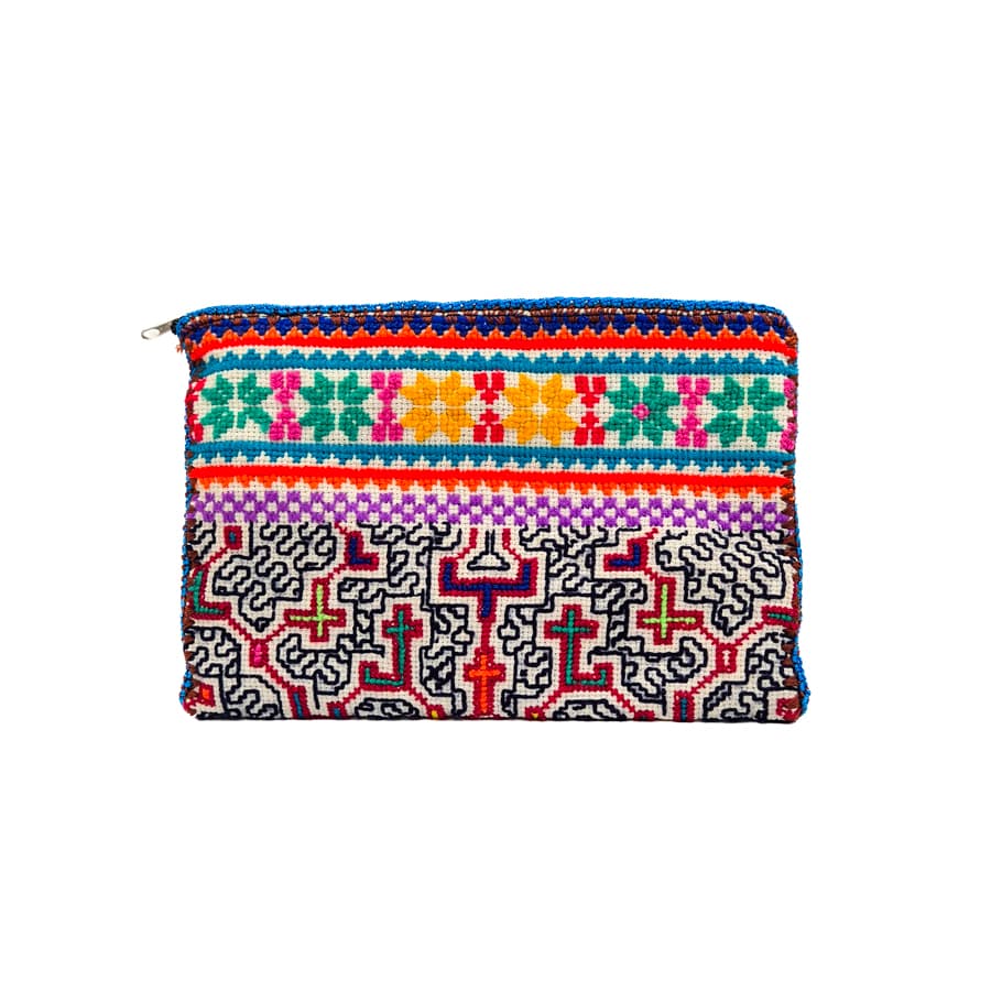 This handmade pouch combines a classic black-and-white labyrinth pattern, inspired by the spiritual energy lines of the Shipibo-Conibo, with colorful stripes in red, orange, yellow, green, pink, and blue. The vibrant design is reminiscent of rainbow ribbons and brings lively contrasts to the traditional embroidery.