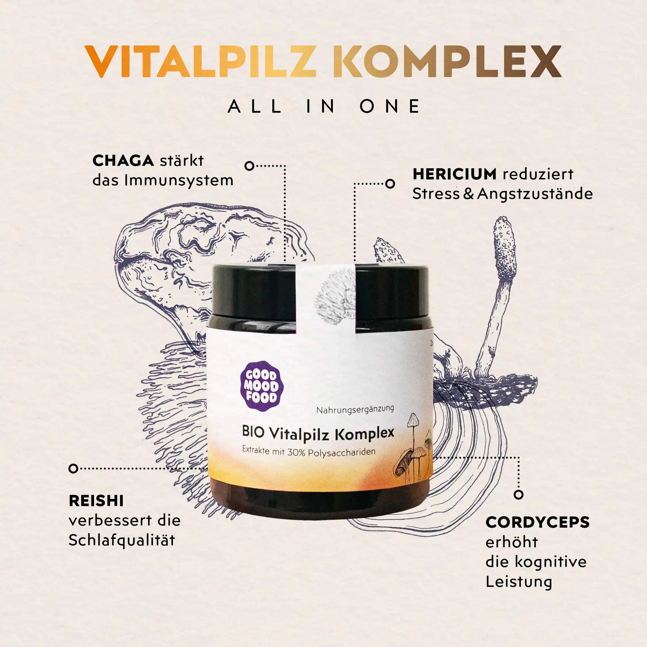 - Bio Vitalpilz-Extrakte: Cordyceps, Chaga, Reishi, Hericium