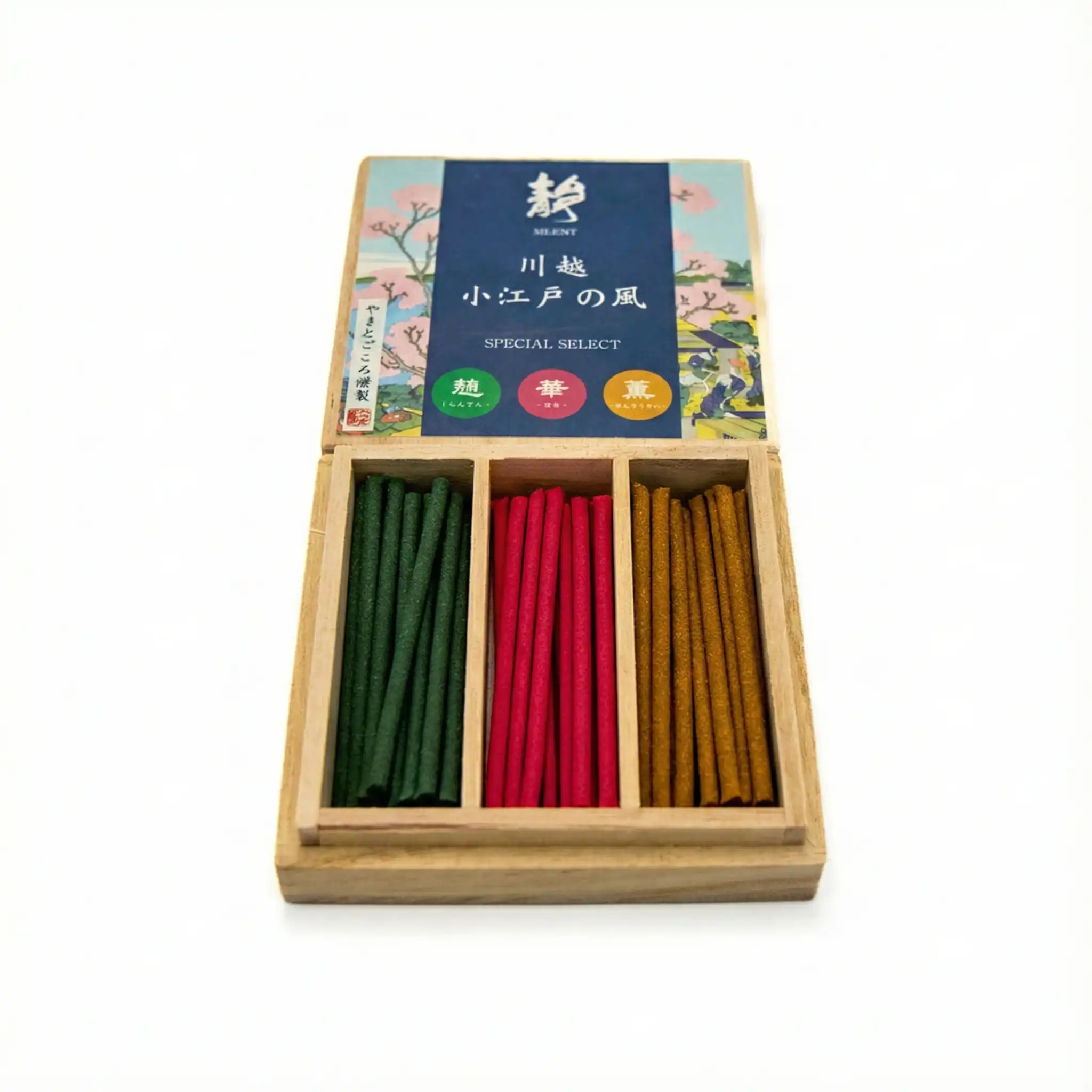 Der Name auf der Box „Kawagoe Koedo no Kaze“ bedeutet „Der Wind von Klein-Edo Kawagoe“ und verweist auf eine berühmte Stadt nördlich von Tokio, bekannt für ihre historischen Kurazukuri-Lagerhäuser und nostalgische Altstadt. Dieses Räucherset bringt ein Stück dieses Flairs als feines Duftritual in dein Zuhause.