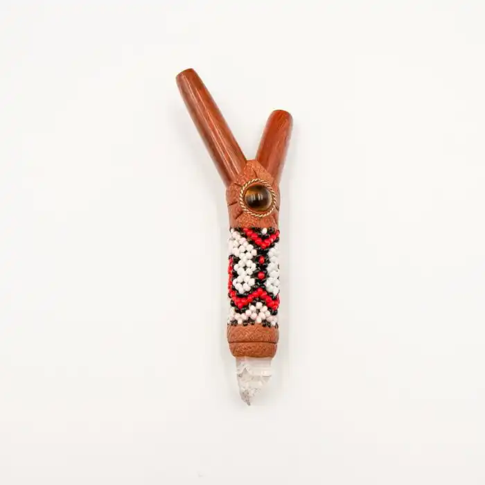 Der Kuripe Rapé Schnupftabak Applikator ist eine meisterhaft gestaltete Kreation, speziell für die präzise Anwendung von Schnupftabak in rituellen Zeremonien. Verziert mit edlen Steinen, darunter Katzenauge und Bergkristall, vereint dieser Applikator Funktionalität mit ästhetischem Glanz in einer harmonischen Farbpalette aus Weiß, Rot und Schwarz.