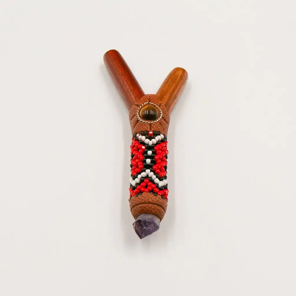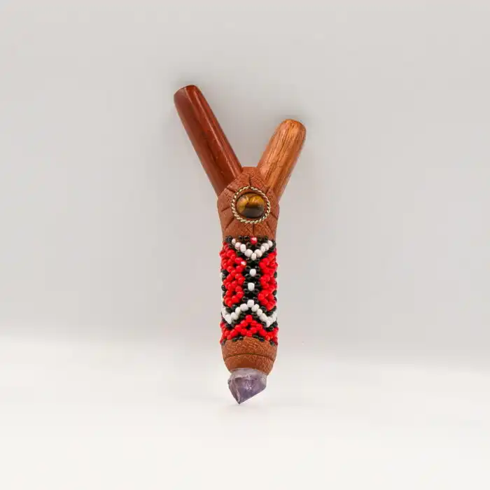 Der Kuripe Rapé Schnupftabak Applikator ist eine kunstvolle Kreation, die speziell für die präzise Anwendung von Schnupftabak in rituellen Zeremonien entworfen wurde. Verziert mit edlen Steinen, darunter Katzenauge und Amethyst, verschmilzt dieser Applikator Funktionalität mit einer ansprechenden Farbpalette aus Rot, Weiß und Schwarz.