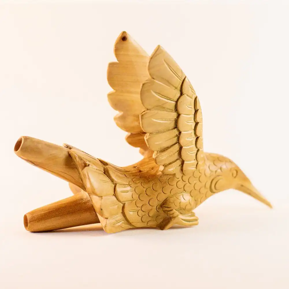 Schöner und exklusiver Kolibri-Kuripe, handgeschnitzt in Bali. Diese Schnupfröhrchen werden aus einem einzigen Stück Holz geschnitzt.