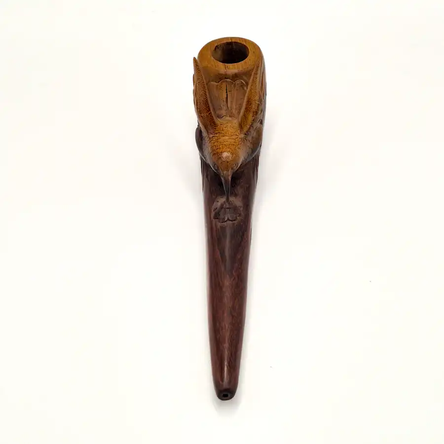 Der Kolibri gilt in vielen indigenen Kulturen Südamerikas als Bote zwischen den Welten – ein Symbol für Leichtigkeit, Freude und Herzenergie. Seine feine Ausarbeitung verleiht der Pfeife eine lebendige, kraftvolle Präsenz.