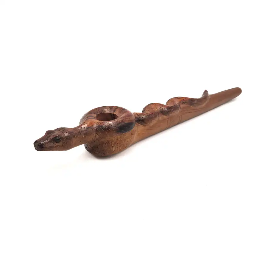 Die Pfeife wurde in Bali von erfahrenen Kunsthandwerkern in traditioneller Handarbeit gefertigt. Die Kombination aus balinesischem Handwerk und der spirituellen Symbolik der Schlange macht diese Pfeife zu einem einzigartigen Ritualobjekt.