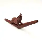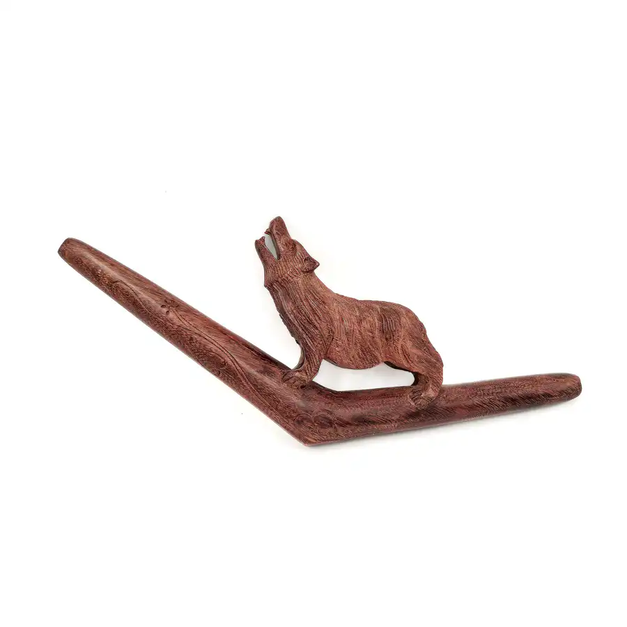 Dieser einzigartige Rapé Applikator (Tepi) wurde aus hochwertigem Tamarind Holz handgeschnitzt und vereint kraftvolle Symbolik mit traditionellem Kunsthandwerk. Das aus einem einzigen Stück Holz gefertigte Design zeigt einen heulenden Wolf, der für Stärke, Führung und spirituelle Verbindung steht.